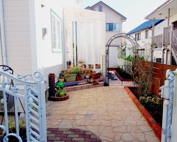 お隣との境界に目隠しフェンスを設置、アーチを戻し、花壇も造りました。