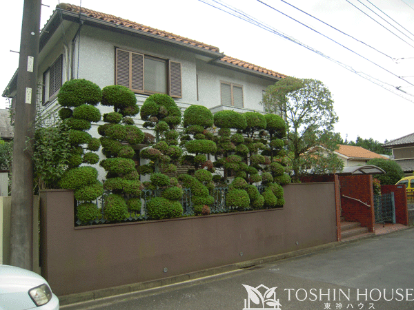 洋風なお家の塀からのぞく和風な植木に少し違和感をおぼえます。