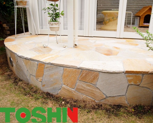 お庭に出られるR(アール)のデッキは難易度MAXでしたが、美しく自然石が貼られています。