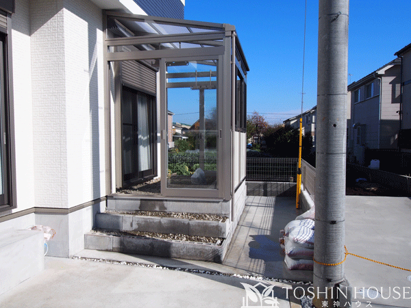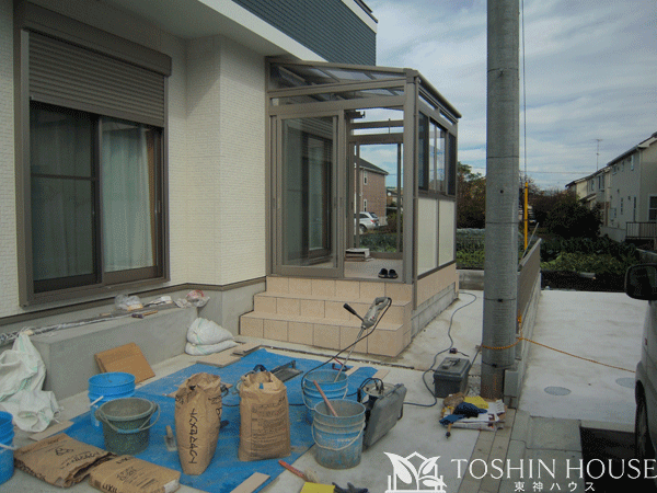 タイルテラスの下地を造ったら、次にサンルームの組み立てに入ります。