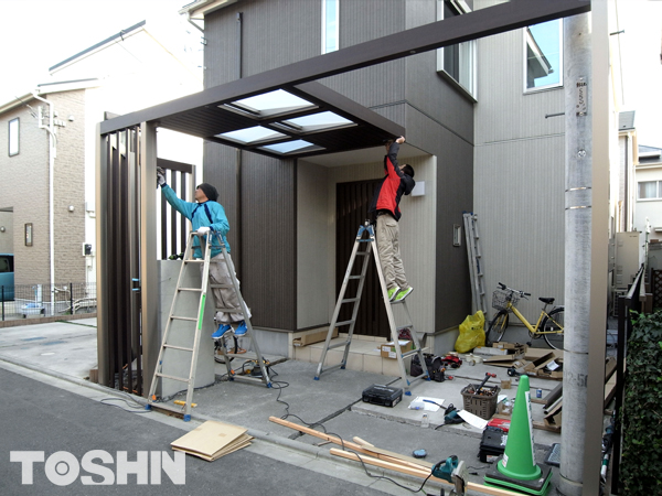 柱を立てて道路と玄関の間に屋根をかけていきます。